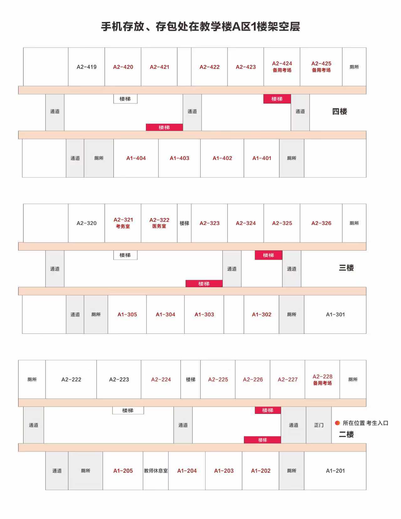 (1)考生携带的任何与考试无关物品统一存放于物品存放点。考点在教学楼A区一楼架空层监控区域设有手机存放柜和存包处,考生须在每场考试前按照现场指引有序存放物品。